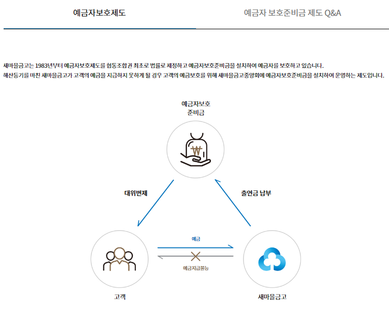 새마을금고에는 새마을금고법에 따라 예금자를 보호하는 제도가 있습니다. 보호 한도는 원금과 이자를 합하여 1인당 5천만원입니다. 예금자보호법에 따라 예금자의 자산을 보호하는 1금융권과는 달리 새마을금고는 자체적으로 예금자보호기금을 설치하여 운영하는 것입니다. '출자금 통장'은 예금자 보호 대상이 아닙니다.