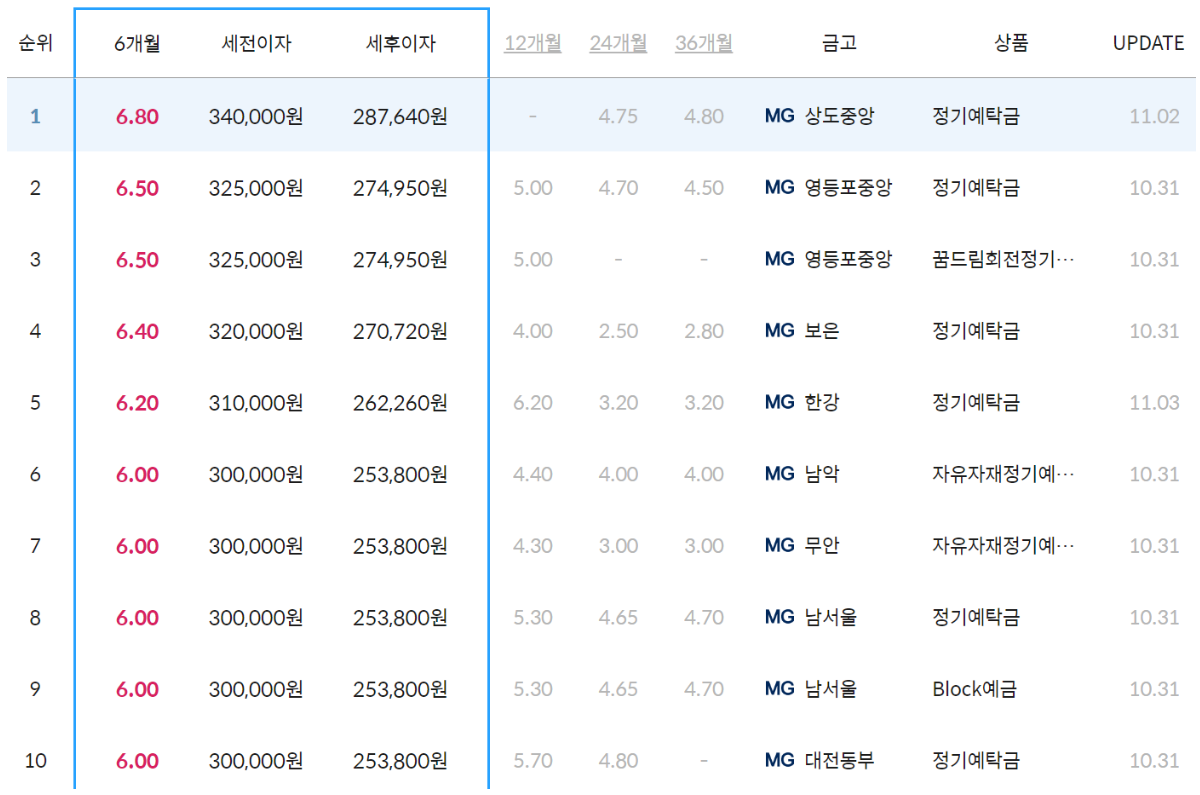 새마을금고 예금금리 가장 높은 곳은 최고 6.8% 상도중앙새마을금고 본점입니다.