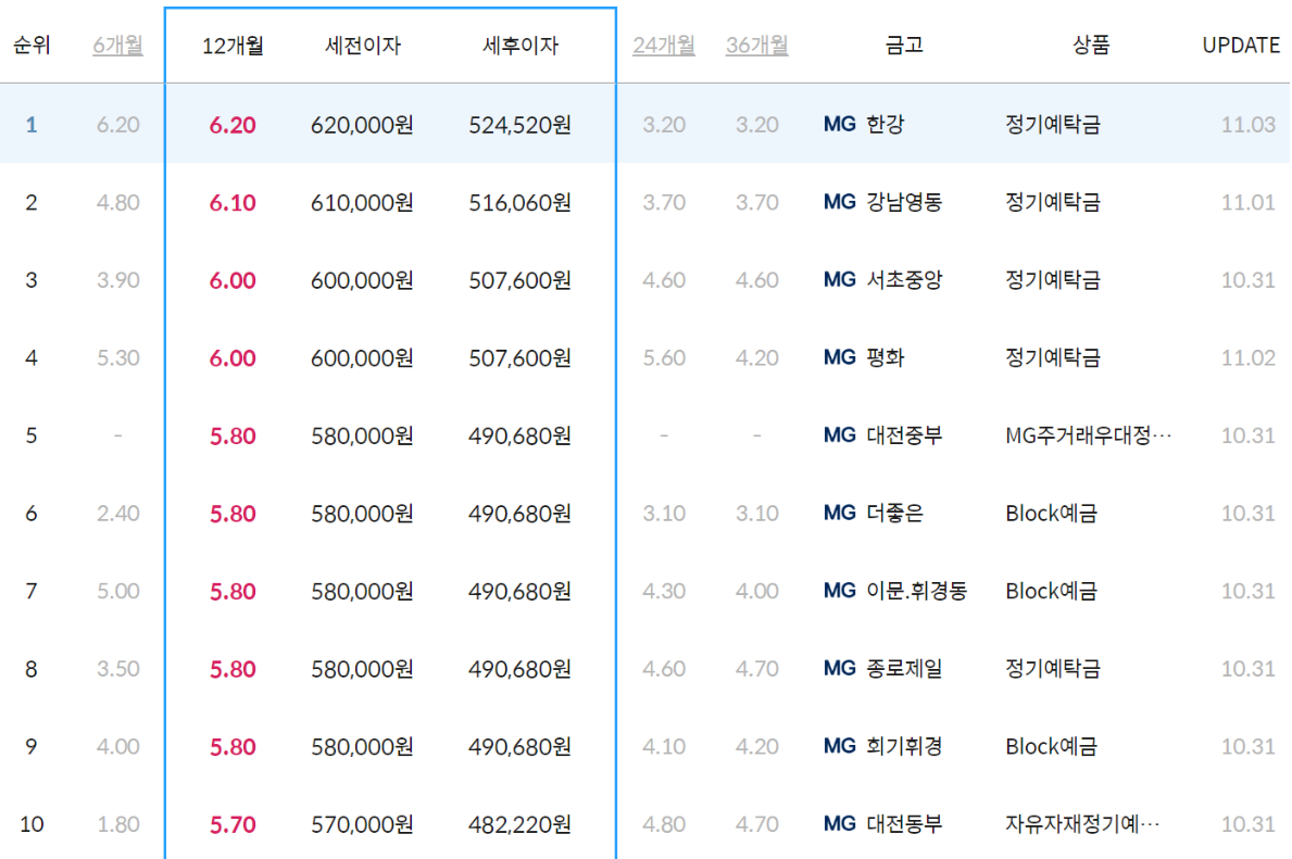 새마을금고 예금금리 가장 높은 곳은 최고 6.2% 한강새마을금고입니다.