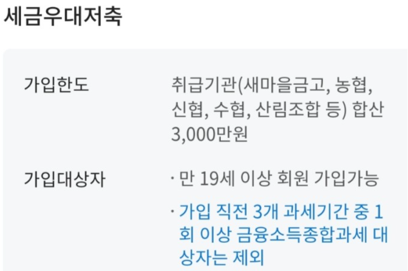 새마을금고에서 예금, 적금을 가입할 경우에는 세금우대 혜택을 받을 수 있습니다. 이것은 상호금융권 전체에 해당하며 모두 합쳐서 3천만원의 한도입니다.