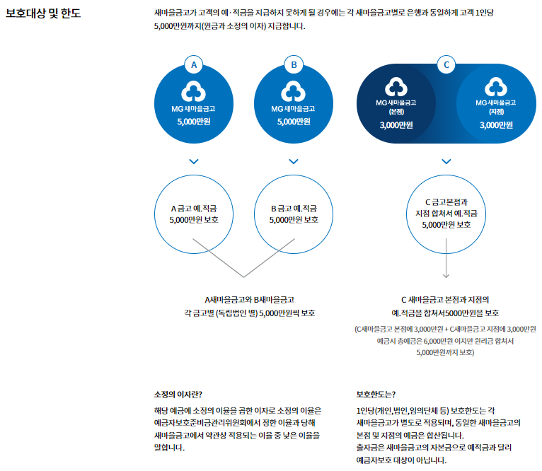 새마을금고는 본점과 지점에 각각 예금이나 적금을 가입했을 경우, 이를 모두 합쳐 최대 5천만원까지만 보호합니다. 그러니 같은 새마을금고를 이용하시더라도 같은 본지점관계에 있는 새마을금고에서 5천만원 이상을 예치하실 때에는 상당한 주의가 필요합니다.
