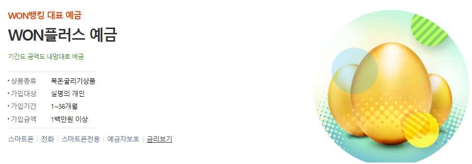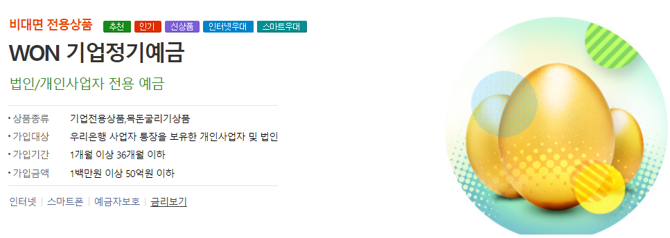 WON 기업정기예금은 상품의 이름처럼 법인이나 개인사업자 전용 예금으로 비대면 전용상품입니다. 금리가 높고 만기를 자유롭게 지정할 수 있어 사업자들에게 인기가 많은 기업 전용 상품입니다.