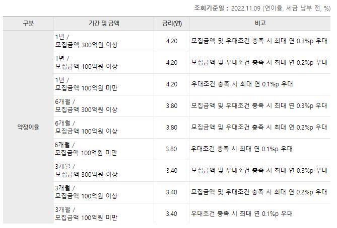 - 모집금액 100억원 미만 12개월 4.20% (우대조건 충족 최대 연 0.1%우대)