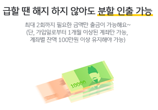 분할해지는 가입일로부터 1개월 이상된 계좌만 가능하며 계좌 잔액이 100만원이상 잔액을 유지해야 가능합니다. 또한 최초 가입 이후에 추가 입금이 불가능하다는 점을 참고하시기 바랍니다.