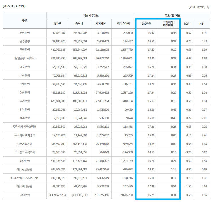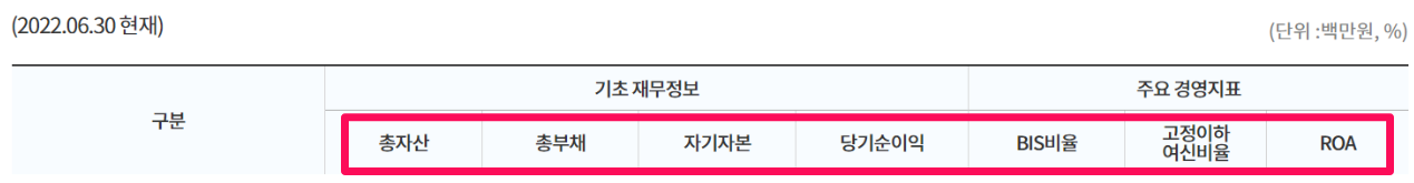 이 외에도 은행이 수익을 얼마나 잘 내고 있는지 알려주는 ROA(총자산(순)이익률), 높을 수록 안전한 유동성 비율, 당기순이익, 연체율 등을 확인해보면 좋습니다.