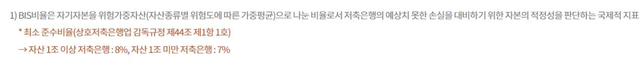 BIS비율은 금융기관이 자체적으로 얼마나 충분한 자금을 가지고 있는지를 알려줍니다. 위험 자산 대비 자기 자본의 비율을 의미하며 높을 수록 안전하고, 8% 이상이면 안전하다고 볼 수 있습니다.