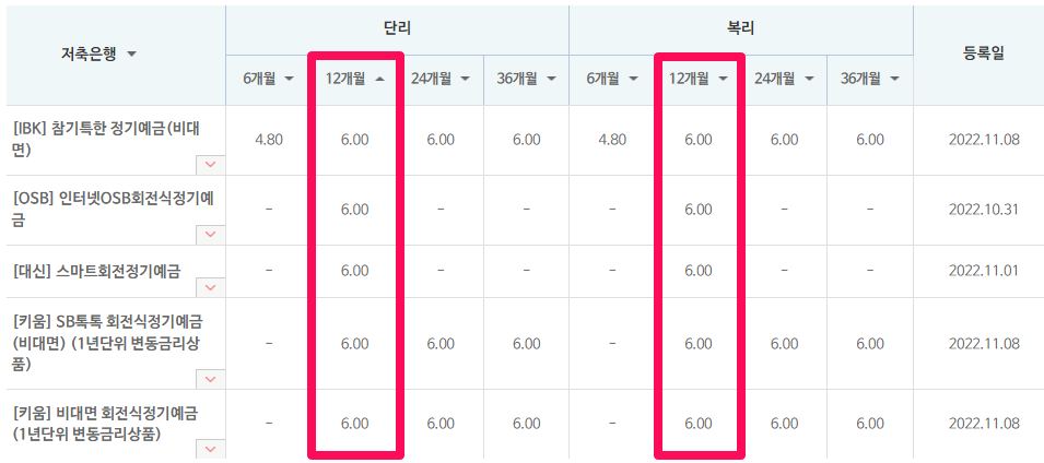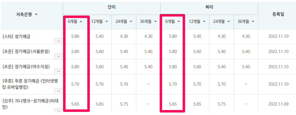 6개월 만기의 저축은행 정기예금 금리비교는 제법 눈에 띄는 장점이 있습니다. 12개월을 저축하는 것과 비슷한 금리가 나오기 때문입니다. 아무래도 주식 부진 등의 이유로 여유 자금의 움직임이 눈에 띄게 보이고 이러한 자금들은 단기로 운영하고자 하는 소비자 심리가 반영된 것으로 봐야겠습니다. 그러한 금융소비자를 잡기 위해 은행에서는 단기간에도 매력적인 금리를 제시해 고객을 유치하고자 하는 것입니다.
