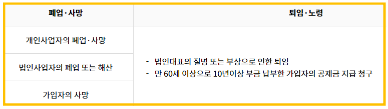 폐업·사망, 퇴임·노령 등 의 사유가 이에 해당합니다. 퇴임·노령의 사유로 노란우산공제 지급 사유가 발생 할 때에는 법인 대표의 질병 또는 부상으로 인한 퇴임이거나 만 60세이상으로 10년이상 부금 납부한 가입자의 지급 청구가 해당 됩니다.