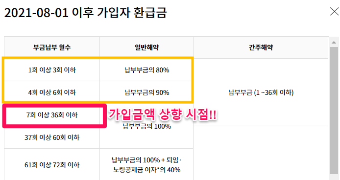 납부 월수가 6회 이하라면 해약 환급금을 100%를 돌려받지 못하게 됩니다. 3회 이하일 경우에는 납부부금의 80%, 6회 이하일 경우에는 납부부금의 90%를 돌려받게 되죠.