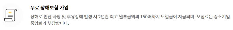 상해로 인한 사망 및 후유장애 발생 시 2년간 최고 월부금액의 150배까지 보험금이 지급되며 보험료는 중소기업중앙회가 부담합니다.
