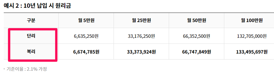 노란우산공제 납입금은 '복리'적용을 받아 '단리'의 적금 상품보다 높은 이자를 받습니다. 월 25만원을 10년간 납입하게 되면 단리보다 복리일 경우 197,674원의 이자를 더 받을 수 있습니다.