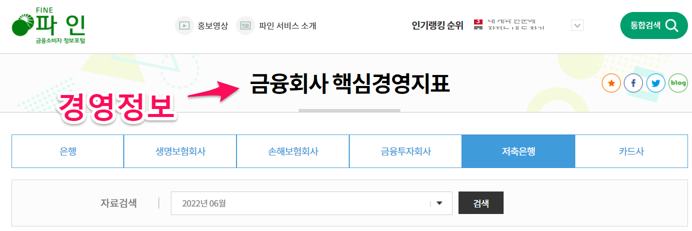 저축은행의 경우에는 은행의 안전성 정보를 바로 얻을 수 있어 정말 편리합니다. '상세'정보에서 '경영정보'를 누르게 되면 금융소비자 정보포털로 바로 연결되며 이 곳에서 해당 저축은행의 최신의 재무정보와 경영지표를 바로 확인할 수 있습니다.