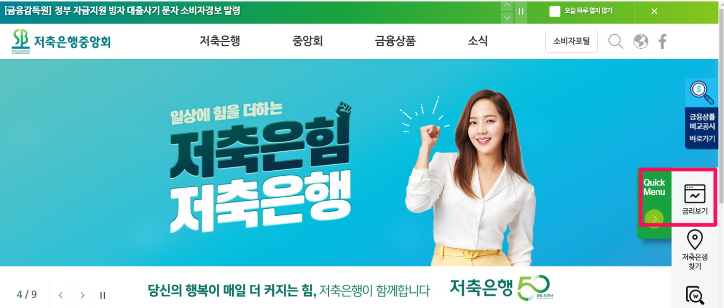 저축은행중앙회의 홈페이지에서 우측의 '금리보기'를 통해 저축은행의 정기예금 금리를 비교할 수 있습니다. 이 곳에서도 예금금리 뿐만이 아니라 적금과 대출금리도 함께 확인하실 수 있습니다.