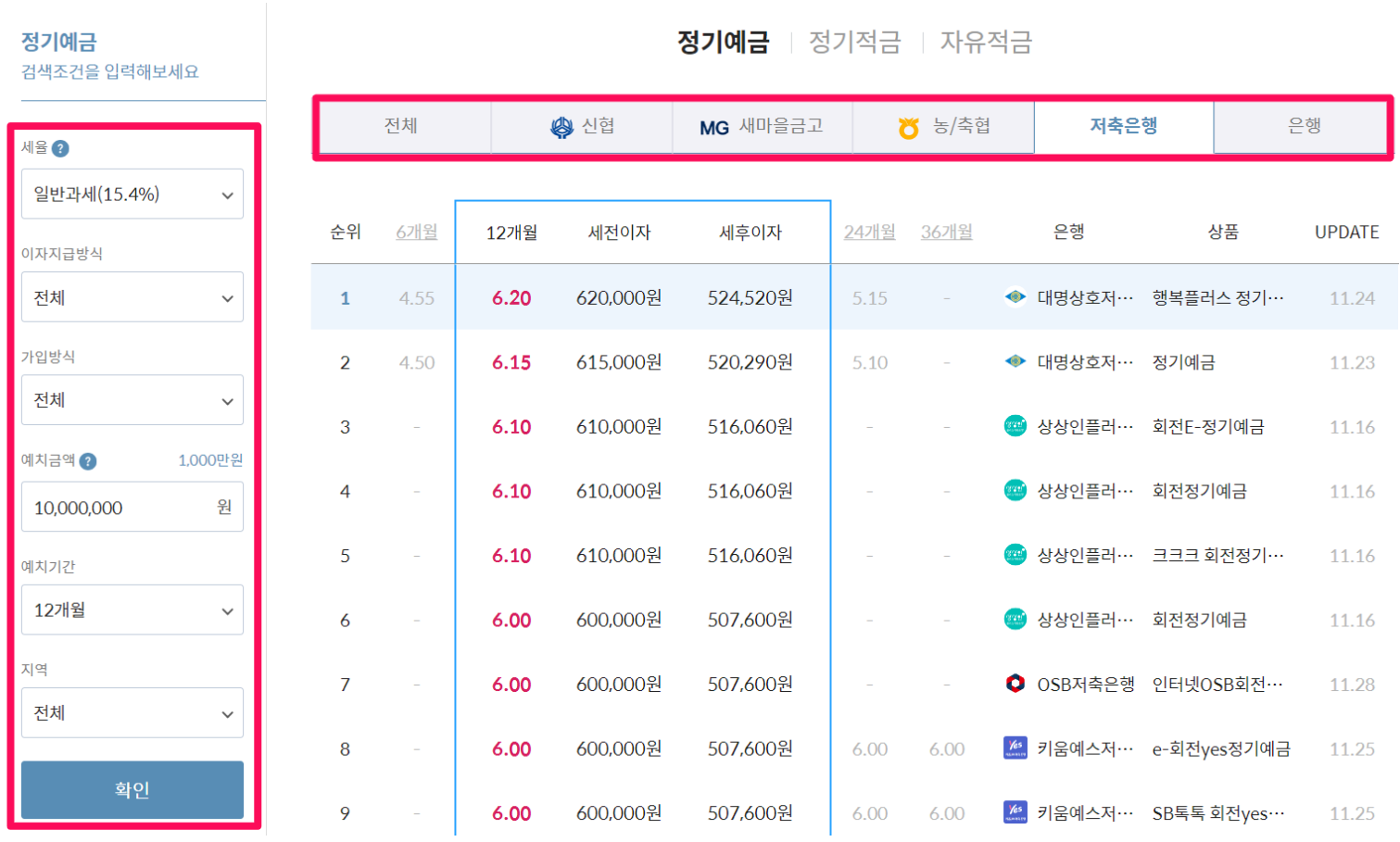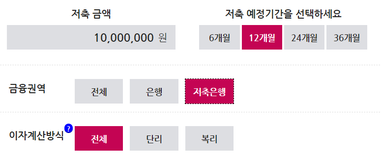 검색하실 때는 저축은행을 선택하고, 예금 하고자 하는 금액과 기간을 선택해주면 더욱 정확한 자료를 얻을 수 있습니다.