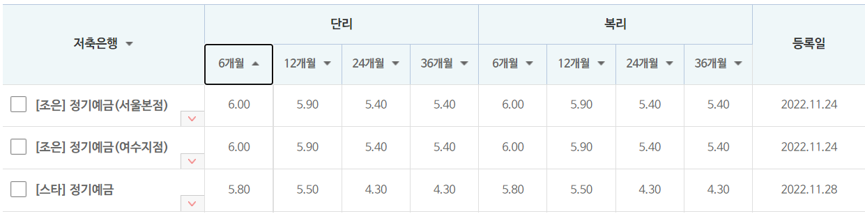 6개월, 12개월, 24개월, 36개월의 금리 차이를 손쉽게 확인할 수 있으며 저축은행의 특성 상 단리와 복리 상품이 함께 출시되는 경우가 많은데 이 점도 함께 고려하여 보기에 편리합니다. 자료의 등록일도 함께 확인할 수 있어 최신의 자료를 파악하기 쉽습니다.