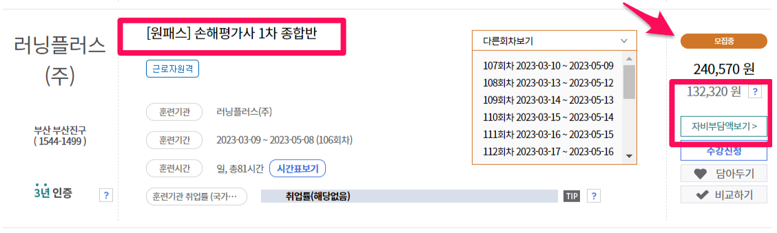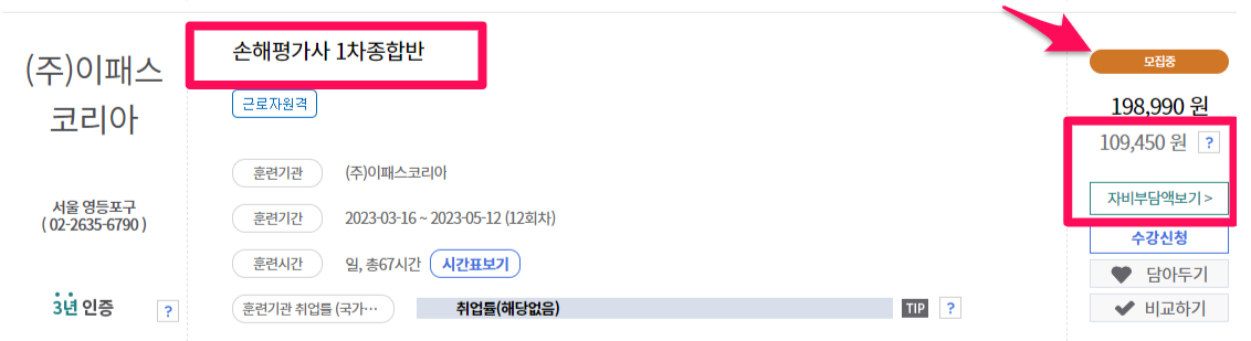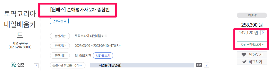 국민내일배움카드를 발급 받으시고 직업훈련포털 HRD-Net에서 훈련과정을 검색해보시면 국비지원이 가능한 교육기관에서 손해평가사 교육 과정 목록을 확인할 수 있습니다. 교육 기관과 과정마다 수강 금액이 다르지만 매우 작은 본인 부담금으로 교육 과정을 이수하실 수 있습니다. 손해평가사를 준비하시며 강의의 도움을 필요로 하시는 분이시라면 국민내일배움카드를 신청 받으시고 국비 지원금으로 손해평가사 자격증에 합격하실 수 있습니다.