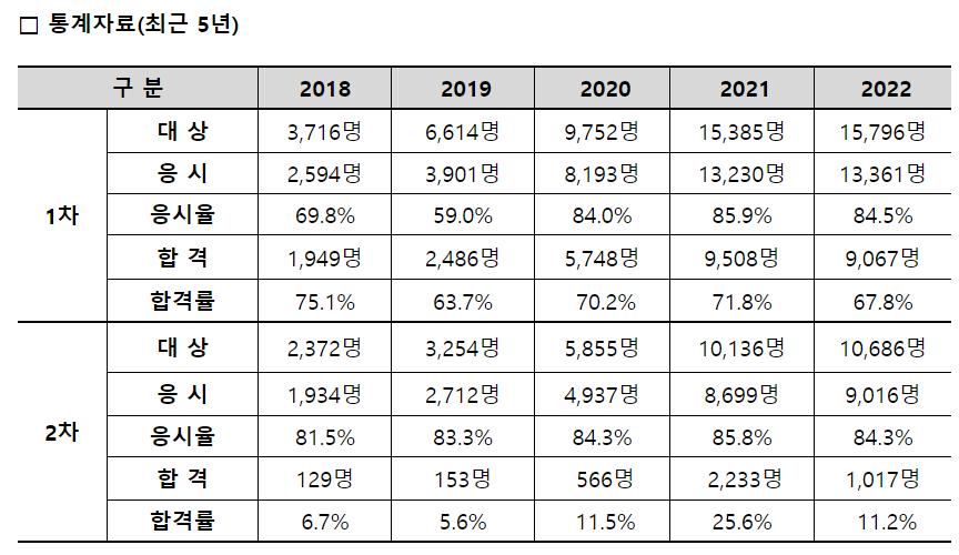손해평가사는 한해 1만명 넘게 응시하고 있으며 5년 사이에 응시자가 6배 증가하였습니다. 2022년 1차 합격률은 67.8%, 2차 합격률은 11.2%로 2차 합격률이 높지는 않았습니다.하지만 손해평가사 자격을 취득하기 위한 수요가 매년 급증하고 있습니다.